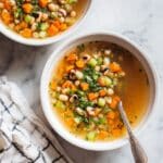 Keywords: 3-pea soup, split peas, chickpeas, black-eyed peas, vegetarian soup, healthy soup, easy soup recipe, vegetable broth soup
