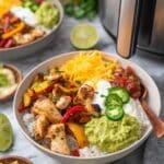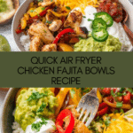 Keywords: air fryer chicken fajita bowls, quick fajitas, healthy chicken fajitas, Tex-Mex dinner, air fryer recipes, chicken and peppers