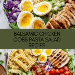 A vibrant and hearty Balsamic Chicken Cobb Salad with Pasta featuring tender grilled chicken marinated in balsamic vinegar, tossed with rotini pasta, fresh mixed greens, creamy avocados, hard boiled eggs, crispy bacon, cherry tomatoes, cucumber, and crumbled feta cheese. Finished with a tangy honey white balsamic vinaigrette, this salad combines flavor and texture for a fulfilling meal perfect for lunch or dinner.