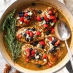 Store leftover balsamic chicken in an airtight container in the refrigerator for up to 3 days. Reheat gently in a skillet over low heat or microwave until warmed through. To prevent the sauce from separating, stir occasionally while reheating. It’s best to add fresh berries and arugula just before serving rather than storing them with the chicken.