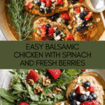 This Balsamic Chicken recipe features tender, pan-seared chicken breasts smothered in a rich balsamic glaze loaded with fresh spinach, blueberries, strawberries, and crumbled feta. Paired with arugula and glazed nuts, it offers a perfect balance of savory, sweet, and tangy flavors in a quick stovetop dish ideal for a vibrant weeknight dinner.