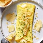 - Finish and serve: Roll or slide the omelet onto a plate seam side down. Brush the top with the remaining 1 teaspoon of unsalted butter. Sprinkle crushed sour cream & onion potato chips and sliced chives over the top for crunch and flavor. Serve immediately.