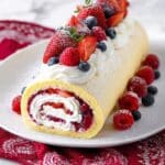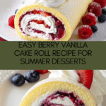 Keywords: berry cake roll, sponge cake roll, mascarpone whipped cream cake, berry dessert, roll cake recipe, vanilla cake roll, fresh berry dessert