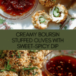Boursin Cheese Stuffed Olives are a delightful appetizer that combines creamy, herbed cheese with the subtle sweetness of olives. Perfectly coated and served with a fig and honey sauce, these bite-sized treats are sure to impress at any gathering.