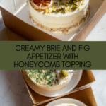 This Brie and Fig Appetizer features a luscious whipped triple crème brie and cream cheese blend, enhanced with a sweet fig and orange spread and crunchy pistachios. The creamy center is encased within a Brie wheel, topped with dried mandarin slices, honeycomb, and fresh rosemary, making it an elegant, flavorful appetizer perfect for entertaining.