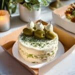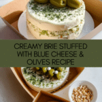 This elegant Brie with Blue Cheese and Olive Filling recipe combines creamy triple creme brie with tangy blue cheese and briny Castelvetrano olives for a sophisticated appetizer. The creamy whipped brie base is flavored with fresh chives and optional vodka, then stuffed inside a brie wheel and garnished with blue cheese-stuffed olives. Perfect for entertaining, this make-ahead cheese board centerpiece is both visually stunning and delicious.