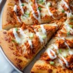 This Buffalo Chicken Pizza combines a homemade yeast dough crust with a creamy, tangy ranch-seasoned cream cheese base, topped with spicy buffalo chicken and melted mozzarella. It’s a delicious twist on classic buffalo chicken flavors, baked to golden perfection and finished with fresh green onions and your choice of ranch or blue cheese dressing.