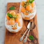 - Assemble the Dessert: To serve, layer the chilled cantaloupe balls with the chilled coconut rose cream in serving glasses or bowls. Top each serving with a sprinkle of chopped pistachios and garnish with fresh mint leaves for a burst of color and aroma.