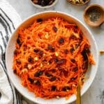 A refreshing and sweet carrot raisin salad featuring grated carrots, juicy raisins, and crushed pineapple, all tossed in a creamy honey-mayo dressing with a hint of apple cider vinegar. Perfect as a side dish or a light snack.