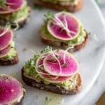 - Add Toppings: Lay thin slices of watermelon radish on top of the avocado. Sprinkle with microgreens or sprouts, then drizzle with olive oil. Finish with a light sprinkle of sea salt and freshly cracked black pepper.