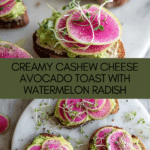 A vibrant and creamy Cashew Cheese Avocado Toast topped with crisp watermelon radishes and fresh microgreens. This dairy-free, vegan-friendly recipe combines soaked cashews blended into a savory cheese-like spread with mashed avocado on toasted multigrain bread, finished with a drizzle of olive oil and a hint of lemon for a refreshing, nutritious bite perfect for breakfast or a light snack.