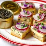 Delightfully elegant Caviar Butter Radish Tea Sandwiches featuring thinly sliced radishes layered with a flavorful lemon-chive butter, served on toasty brioche squares and topped with luxurious caviar. Perfect for sophisticated gatherings or afternoon tea.