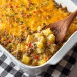 This Cheesy Ground Beef & Potato Casserole is a hearty, comforting dish perfect for family dinners. Combining savory browned ground beef, seasoned frozen potatoes with onions and peppers, creamy cheddar and celery soups, and topped with lots of melted sharp cheddar cheese, this casserole bakes to golden perfection with a crispy cheesy crust. It’s convenient, flavorful, and easy to customize with your favorite seasonings.