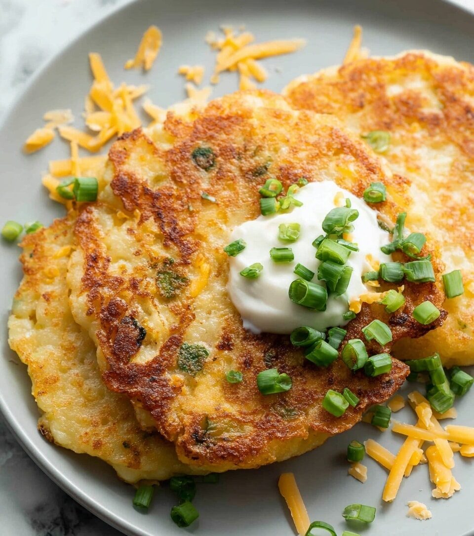 Cheesy Mashed Potato Pancakes are a delicious way to transform simple potatoes into a crispy, flavorful dish. Perfect as a comforting side or a tasty snack, they combine creamy mashed potatoes with melted cheese and fresh green onions for a satisfying bite.