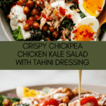 Keywords: chicken kale salad, roasted tomatoes, crispy chickpeas, tahini dressing, healthy salad, Mediterranean salad, protein rich salad