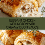 Chicken Wellington with Dijon Cream Sauce is a delightful dish featuring tender chicken breasts wrapped in flaky puff pastry with a savory mushroom and spinach filling, complemented by a rich and creamy Dijon sauce. Perfect for an elegant dinner or special occasion.