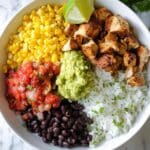 - Prepare Toppings: While the chicken marinates and cooks, prepare your toppings: heat the rice, rinse and drain the black beans, and have the corn salsa, guacamole, and salsa ready for assembly.