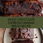 Keywords: Chocolate banana bread, espresso banana bread, chocolate espresso banana bread, moist banana bread, chocolate chip banana bread, coffee flavored banana bread