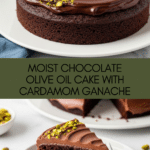 Keywords: chocolate olive oil cake, chocolate cake, olive oil cake, spiced chocolate cake, cardamom chocolate cake, moist chocolate cake, chocolate ganache, pistachio topping