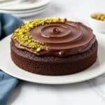 - Assemble the cake: Place the cooled cake on a serving plate or cake stand. Spread the ganache evenly over the top using a spatula, swirling it decoratively. Sprinkle chopped pistachios on top if desired for extra texture and flavor.