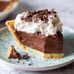 This luscious Chocolate Pie features a flaky blind-baked pie crust filled with a rich and creamy homemade chocolate pudding made from dark chocolate and a blend of whole milk and cream. Topped with whipped cream and extra chopped chocolate, this dessert is perfect for chocolate lovers seeking a classic, indulgent treat.