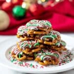 - Add Sprinkles: Immediately after drizzling with the white candy melts, sprinkle holiday-themed sprinkles over the pretzel bites for a festive look.