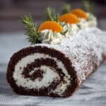 - Decorate and Serve: After chilling, trim the sides of the yule log to tidy up the edges. Dust the outside with powdered sugar for a snowy effect. Pipe whipped cream along the top of the log. Garnish with fresh rosemary sprigs, kumquat slices, and cinnamon sticks for a festive presentation. Slice and serve chilled.