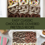 Keywords: chocolate covered pretzels, chocolate dipped pretzels, salty sweet snack, easy party treats, holiday snacks, homemade chocolate pretzels
