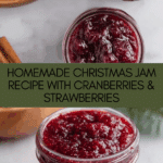 Keywords: Christmas jam, cranberry strawberry jam, holiday preserves, homemade jam, canning recipe, fruit jam with cinnamon, orange zest jam