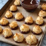 These Coconut Macaroons are chewy, sweet, and perfectly golden baked treats made with sweetened flaked coconut, sweetened condensed milk, and fluffy egg whites. Optionally dipped in rich semi-sweet chocolate, they deliver a delightful combination of textures and flavors. Easy to prepare and freezer-friendly, these macaroons are a classic dessert perfect for any occasion.