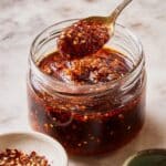 This Copycat Trader Joe’s Chili Onion Crunch is a flavorful spicy condiment featuring a mix of dried onions, garlic, smoked paprika, chili powder, and crushed red pepper flakes suspended in olive oil. Perfect for adding a crunchy, savory kick to your dishes, it’s easy to make and keeps well at room temperature for up to two months.