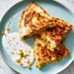 These Corn Quesadillas are a flavorful, cheesy delight combining fresh corn kernels, poblano and jalapeño peppers, and Monterey Jack cheese folded inside warm flour tortillas. Cooked on the stovetop to a perfect golden crisp, they are served with a zesty lime chipotle dipping sauce that adds a creamy and tangy kick. A great appetizer or light meal with a smoky southwestern flair.