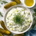 - Combine Ingredients and Adjust Seasoning: In a bowl, mix together the blended cottage cheese, mayonnaise, pickle brine, creamy dijon mustard, dried dill, garlic powder, chopped pickles, salt, and pepper. Stir thoroughly to combine all flavors. Taste and adjust salt and pepper if needed, keeping in mind flavors intensify after chilling.