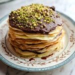 Dubai Chocolate Crepe Cake is a decadent layered dessert featuring thin, tender crepes alternated with rich chocolate ganache and a crunchy pistachio kataifi cream mixture. This luxurious cake combines smooth dark and milk chocolate, buttery crepes, toasted shredded phyllo, and nutty tahini-infused pistachio cream to create an impressive and indulgent treat perfect for special occasions or an elegant dessert.