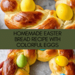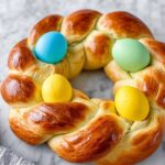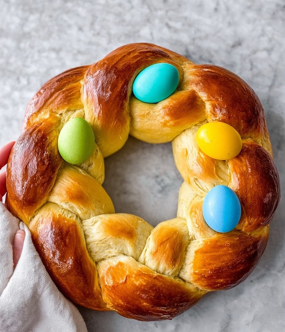 This traditional Easter Bread is a sweet, braided yeast bread flavored with vanilla and citrus zest. Soft and fluffy on the inside, it is beautifully adorned with colorful dyed eggs nestled in the braids, making it a festive centerpiece perfect for celebrating Easter. The bread is lightly sweetened and enriched with butter and eggs, creating a tender crumb and a golden crust.