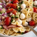 A refreshing and easy-to-make Italian Bow Tie Pasta Salad combining tender pasta, creamy mozzarella pearls, savory salami, crunchy cucumbers, and vibrant vegetables tossed in a zesty homemade dressing. Perfect for picnics, potlucks, or a light meal.