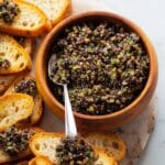This Easy Tapenade recipe is a quick and flavorful Mediterranean olive spread made with Castelvetrano and Kalamata olives, fresh parsley, capers, garlic, lemon juice, and olive oil. Perfect as an appetizer on crusty bread or as a condiment to complement a variety of dishes.