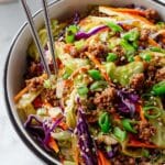 Egg Roll In A Bowl is a quick and flavorful 15-minute dinner that captures the savory taste of classic egg rolls without the wrapper. Ground pork sautéed with garlic and ginger is combined with shredded cabbage, carrots, and a savory sauce made with coconut aminos and toasted sesame oil, making for a low-carb, gluten-free, and easy-to-make dish perfect for busy weeknights.