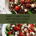 This vibrant Farro Salad with Sizzled Garlic Dressing is a hearty and flavorful dish featuring nutty toasted farro cooked in tangy apple cider vinegar, roasted grape tomatoes, fresh baby spinach, and creamy goat cheese. The star of the salad is the aromatic sizzled garlic, coriander, and cumin oil that is poured over thinly sliced eschallots, giving the salad a warm, fragrant kick. Perfect as a wholesome lunch or a side dish, this salad balances textures and flavors beautifully.