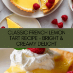 This classic French Lemon Tart, or Tarte au Citron, features a tender sweet tart crust filled with a rich, tangy lemon custard. The filling is cooked gently on the stovetop to a luscious thickness before being baked briefly to set. Served chilled and optionally garnished with whipped cream, lemon slices, or fresh berries, it’s the perfect balance of bright citrus flavor and buttery richness for an elegant dessert.