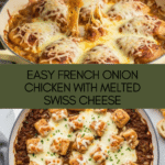 This French Onion Chicken recipe combines tender, caramelized Vidalia onions with juicy, seasoned chicken breast in a rich beef gravy, topped with melted Swiss cheese and served over crusty baguette slices. A comforting, savory dish inspired by classic French onion flavors with a hearty protein twist.