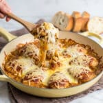 - Combine and Bake: Stir the cooked chicken and caramelized onions into the beef gravy. Sprinkle the shredded Swiss cheese evenly over the top. Place the skillet in a 350°F (175°C) oven and bake for about 10 minutes, or until the cheese is melted and bubbly.