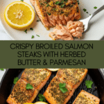 This delicious salmon steak recipe features perfectly seared salmon steaks topped with a flavorful herb butter and parmesan cheese, finished under the broiler for a beautifully caramelized crust and tender, juicy interior. Easy to prepare and packed with rich flavors, it’s an ideal dish for a quick weeknight dinner or special occasion.
