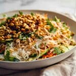- Assemble Salad: In a large bowl, place the softened glass noodles, shredded cooked chicken, sliced green cabbage, cucumber slices, julienned carrot, sliced green onions, coriander, and mint leaves. Pour the dressing over the salad and toss thoroughly to ensure all ingredients are coated evenly. Add half of the lime cashew crumble and toss gently again to incorporate.