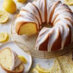 - Glaze the Warm Cake: Brush the warm lemon glaze over the entire cake, including top and sides. Allow the glaze to soak in then apply additional coats until all glaze is used.