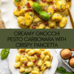 Keywords: gnocchi, pesto carbonara, Italian recipe, pancetta, creamy pasta, basil pesto, quick dinner, authentic carbonara twist