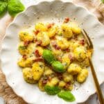 This Gnocchi Pesto Carbonara is a delightful twist on the classic Italian carbonara, combining pillowy potato gnocchi with crispy pancetta and a creamy pesto-infused egg yolk sauce. Perfectly balanced and quick to prepare, it’s a luscious and comforting meal that highlights the fresh flavors of basil pesto and Parmigiano Reggiano.