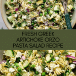 This Greek Artichoke Orzo Pasta Salad is a refreshing and vibrant dish perfect for warm weather. Featuring tender orzo pasta, sweet green peas, tangy artichoke hearts, crisp cucumber, and fresh herbs, all tossed in a zesty lemony vinaigrette and topped with crumbled feta, it’s an ideal side or light main that’s bursting with Mediterranean flavors.