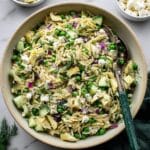This Greek Artichoke Orzo Pasta Salad is a refreshing and vibrant dish perfect for warm weather. Featuring tender orzo pasta, sweet green peas, tangy artichoke hearts, crisp cucumber, and fresh herbs, all tossed in a zesty lemony vinaigrette and topped with crumbled feta, it’s an ideal side or light main that’s bursting with Mediterranean flavors.