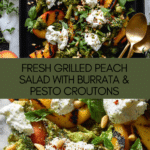 Keywords: Grilled Peach Salad, Summer Salad, Burrata Salad, Pesto Croutons, Grilled Fruit Salad